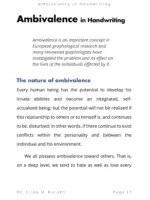 Ambivalence in Handwriting is an e-book in the Inner Circle series written by Dr. Erika M. Karohs, Ph. D., Ed. D. Ambivalence, a conflicting feeling in an individual due to two choices or two values, both of which he or she considers important, is an important concept in European graphological research. Many famous graphologists have investigated the problem and its effect on the lives of individuals affected by it. This e-book contains 12 subheadings that explain in detail from the definition of ambivalence to its signs in handwriting.