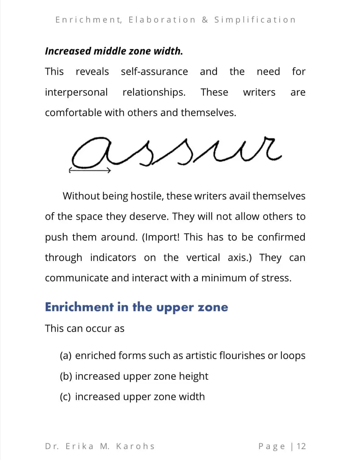 Enrichments and Elaborations in Handwriting + Simplification is an Inner Circle ebook series written by Dr. Erika M. Karohs, Ph. D., Ed. D. This e-book explains in detail about the few people who continue exactly the same way of writing they learned in school. The variations used usually fall into several categories: Elaboration, Enrichment, Copybook, Simplification, and Neglect. This book discusses the different kinds of Elaboration and Enrichment within each writing zone and their meanings.