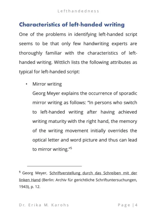 Lefthandedness is an inner circle ebook series written by Dr. Erika M. Karohs, Ph. D., Ed. D. Explains that left-hand writing reveals the same characteristics as right-hand writing, and one problem in identifying left-hand writing seems to be that few handwriting experts are truly familiar with the characteristics of left-hand writing.