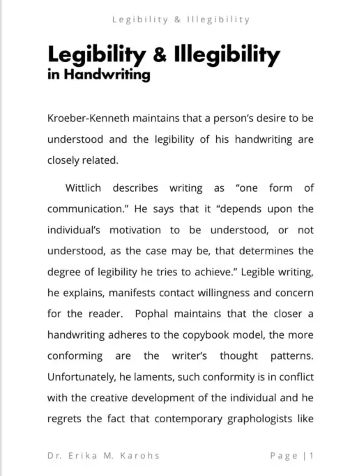 Legibility and Illegibility in Handwriting is an inner circle ebook series written by Dr. Erika M. Karohs, Ph. D., Ed. D. This e-book explains in detail about the legibility & illegibility of handwriting.