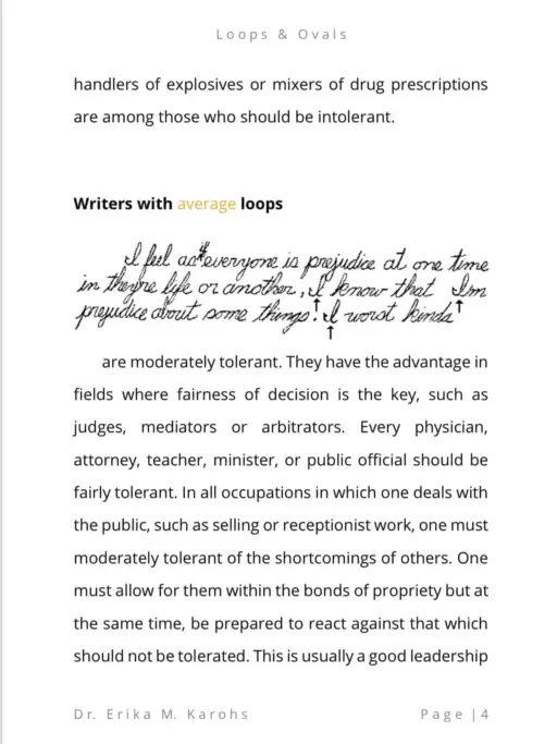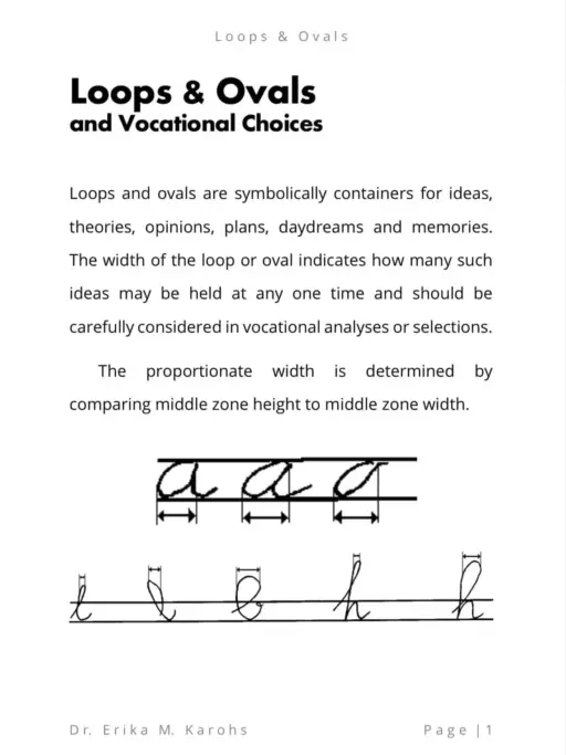 Loops and Ovals and Vocations is an e-book written by Dr. Erika M. Karohs. This e-book explains that loops and ovals are symbolically containers for ideas, theories, opinions, plans, dreams and memories. The width of the loop or oval indicates how many such ideas can be held at one time and should be carefully considered in the major analysis or selection process.