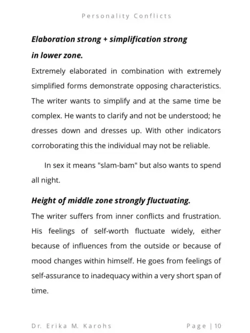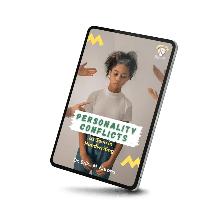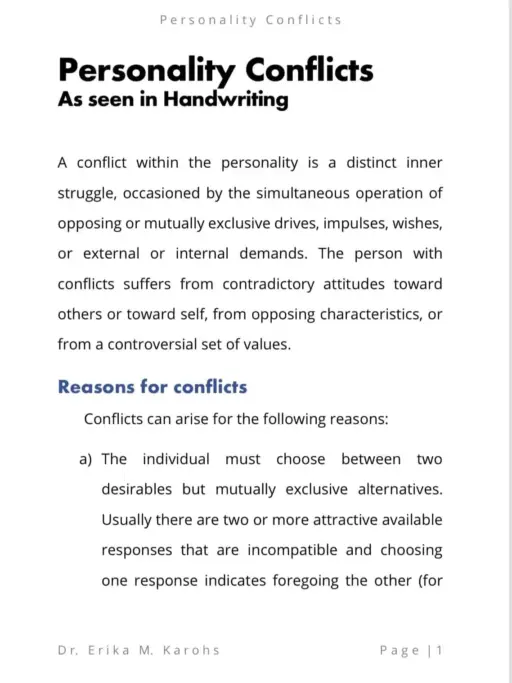 Personality Conflicts as Seen in Handwriting is an e-book written by Dr. Erika M. Karohs. This e-book explains personality conflicts, their graphic signs in handwriting and their meanings.