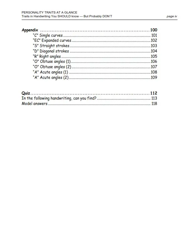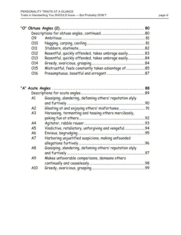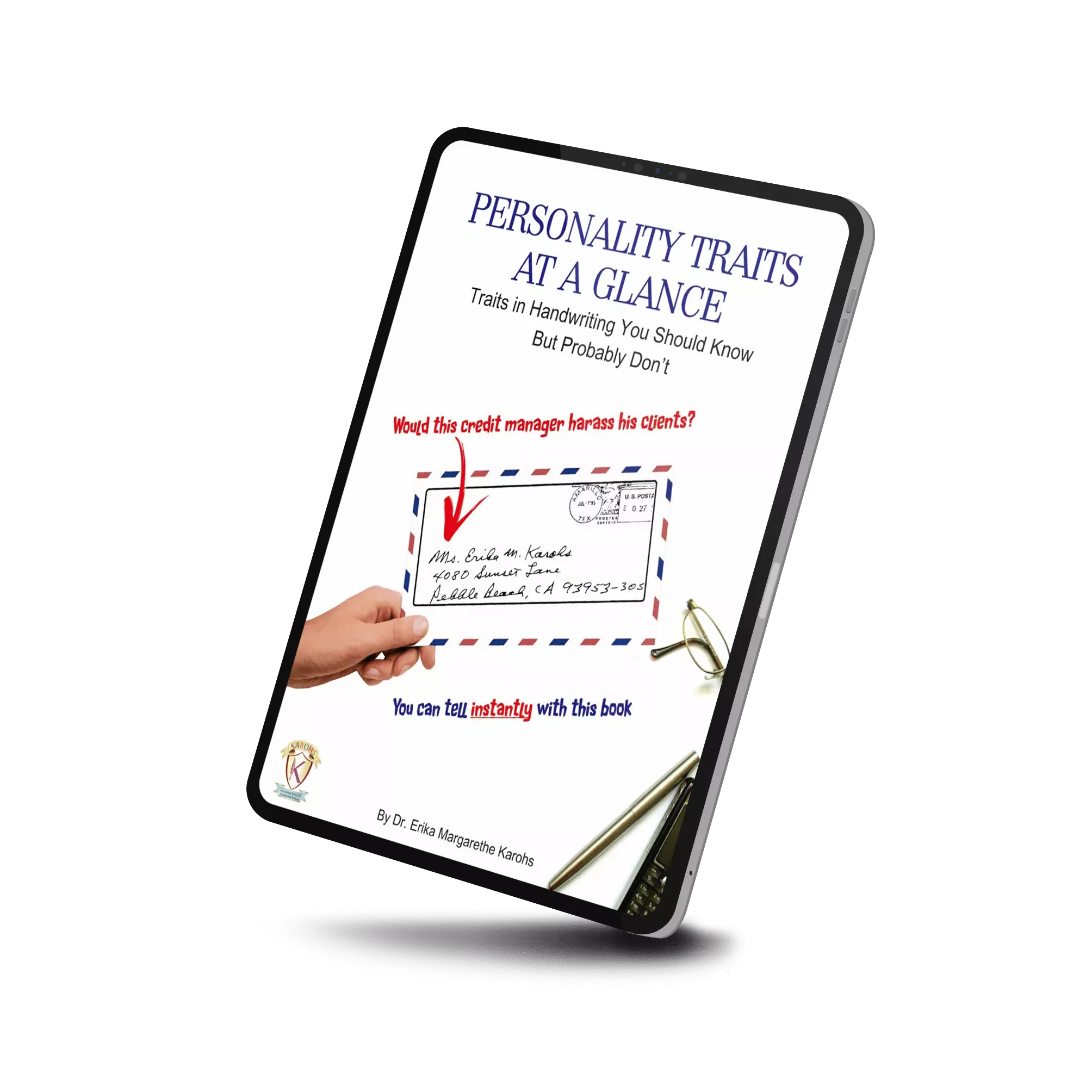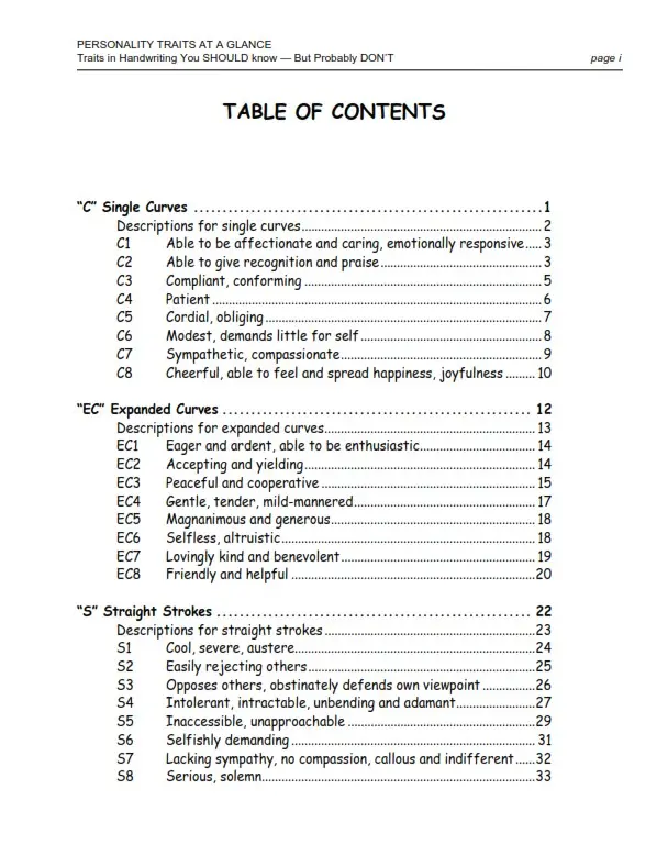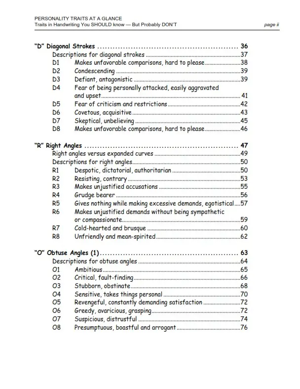 “Personality Traits at a Glance” is a rare and unique graphology reference that introduces readers to a wide variety of personality traits based on curves, loops, strokes, and angles found in handwriting — insights you won’t find in most other graphology books.