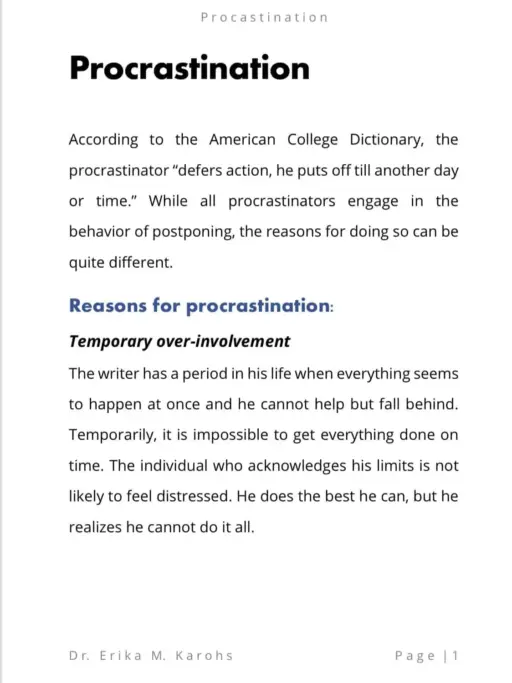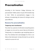 Procastination is an e-book written by Dr. Erika M. Karohs. This e-book explains about people who delay action, they postpone it until another day or time. In addition, it explains the causes of people who like to procrastinate. Of course, along with indicators in handwriting for various types of procrastination.