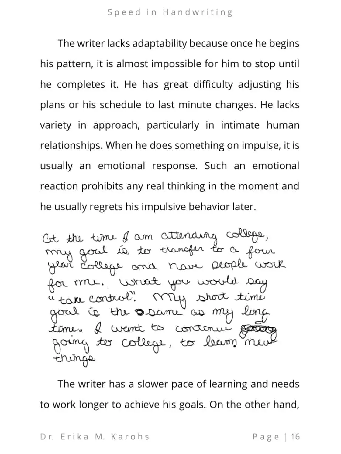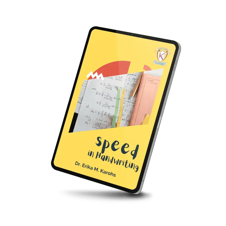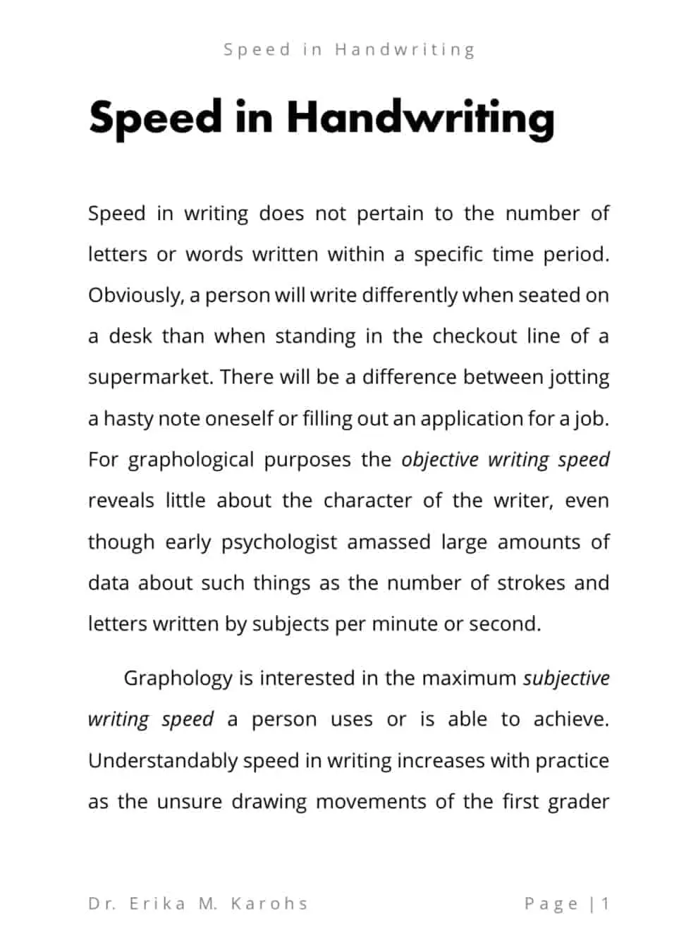 Speed in Handwriting is an e-book written by Dr. Erika M. Karohs. This e-book is about Speed in Handwriting. It discusses the rhythm/speed at which a writer writes, methods for determining writing speed, and the meaning of both fast and slow writing.