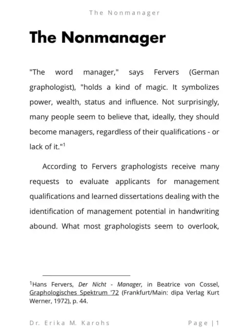 The Nonmanager is an e-book written by Dr. Erika M. Karohs. This e-book is about the meaning of non-manager. The book tells the story of receiving many applicant evaluation requests regarding management qualifications dissertation with what was learned that relates to identifying management potential in handwriting. The real function of the book’s intent is to assess personality as seen in handwriting.