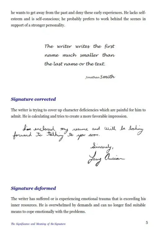 - What different styles of signatures (artistic, simple, segmented, crossed-out) reveal about a person’s true character.