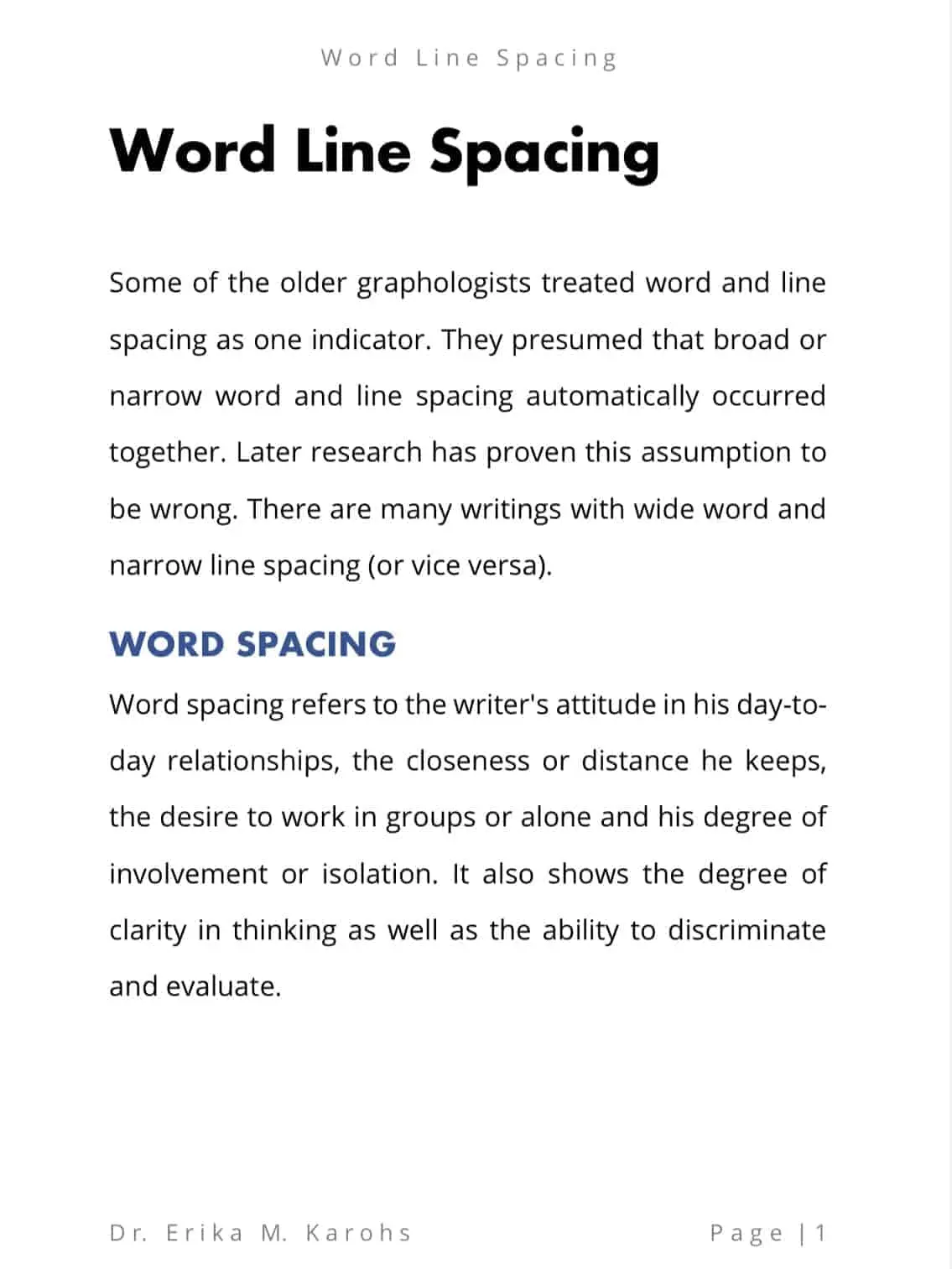 Word Line Spacing is an e-book written by Dr. Erika M. Karohs. This e-book contains the various meanings of spaces, lines and words that refer to the author’s attitude in his daily life. The 3 items can also show the ability to evaluate, the ability to distinguish and the clarity of one’s thinking.