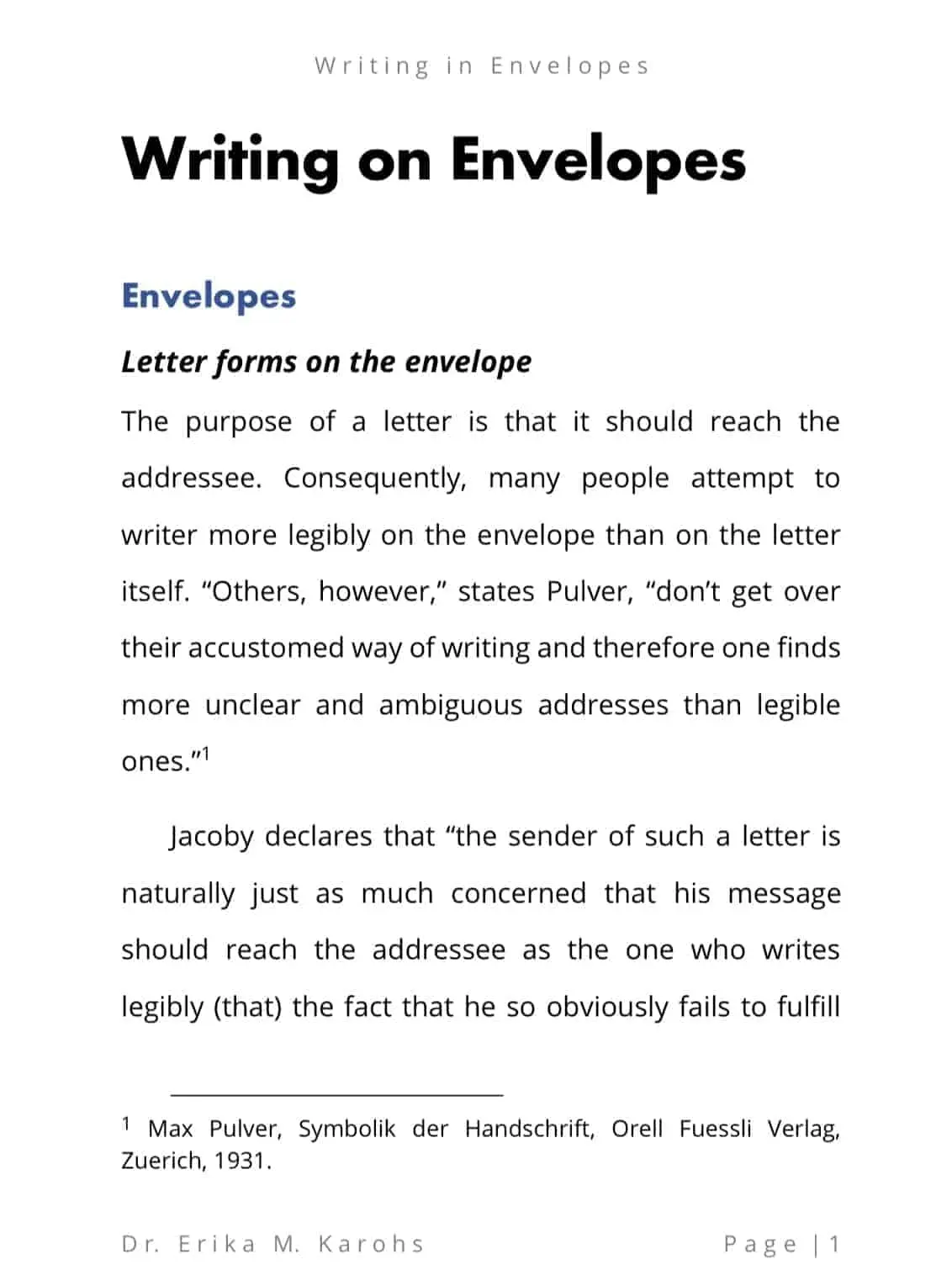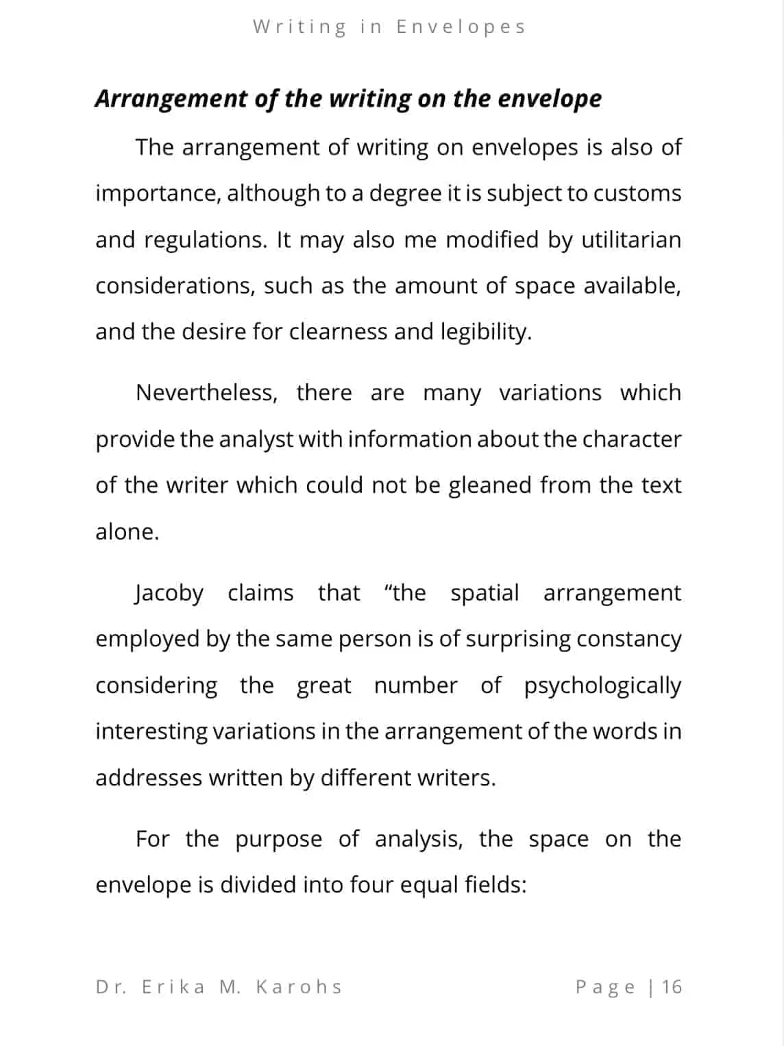 Writing on Envelops is an e-book written by Dr. Erika M. Karohs. This e-book is about writing letters/envelopes properly because the success of sending a letter must be received by the recipient of the letter. The writing (upper/lower case) in letters and envelopes also has its own meaning, for example if the writing on the letter is different from the envelope, the writer has a basic disguise of the writer that he has some indicators of dishonesty and it can be assumed that the writer intends to deceive.